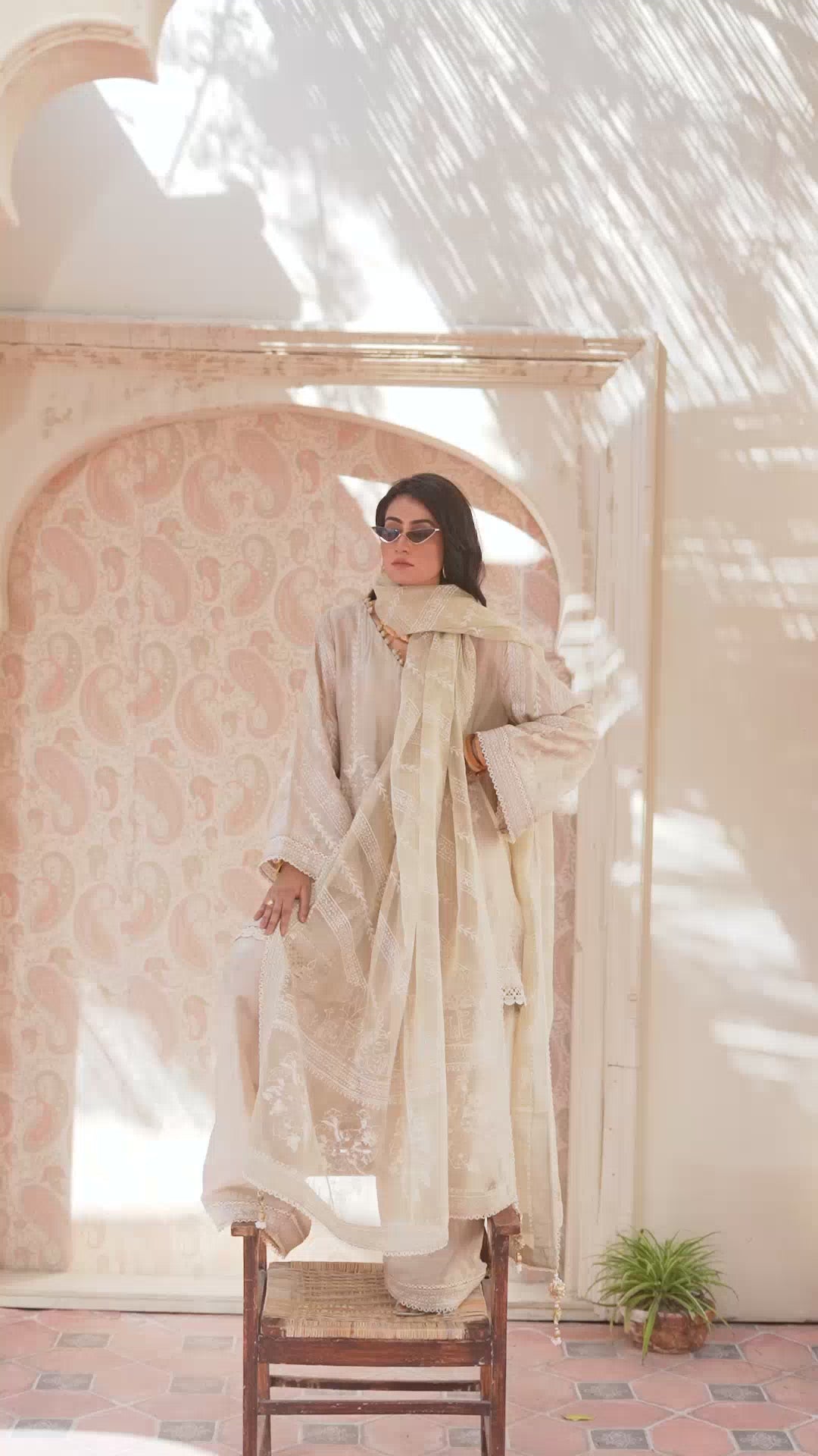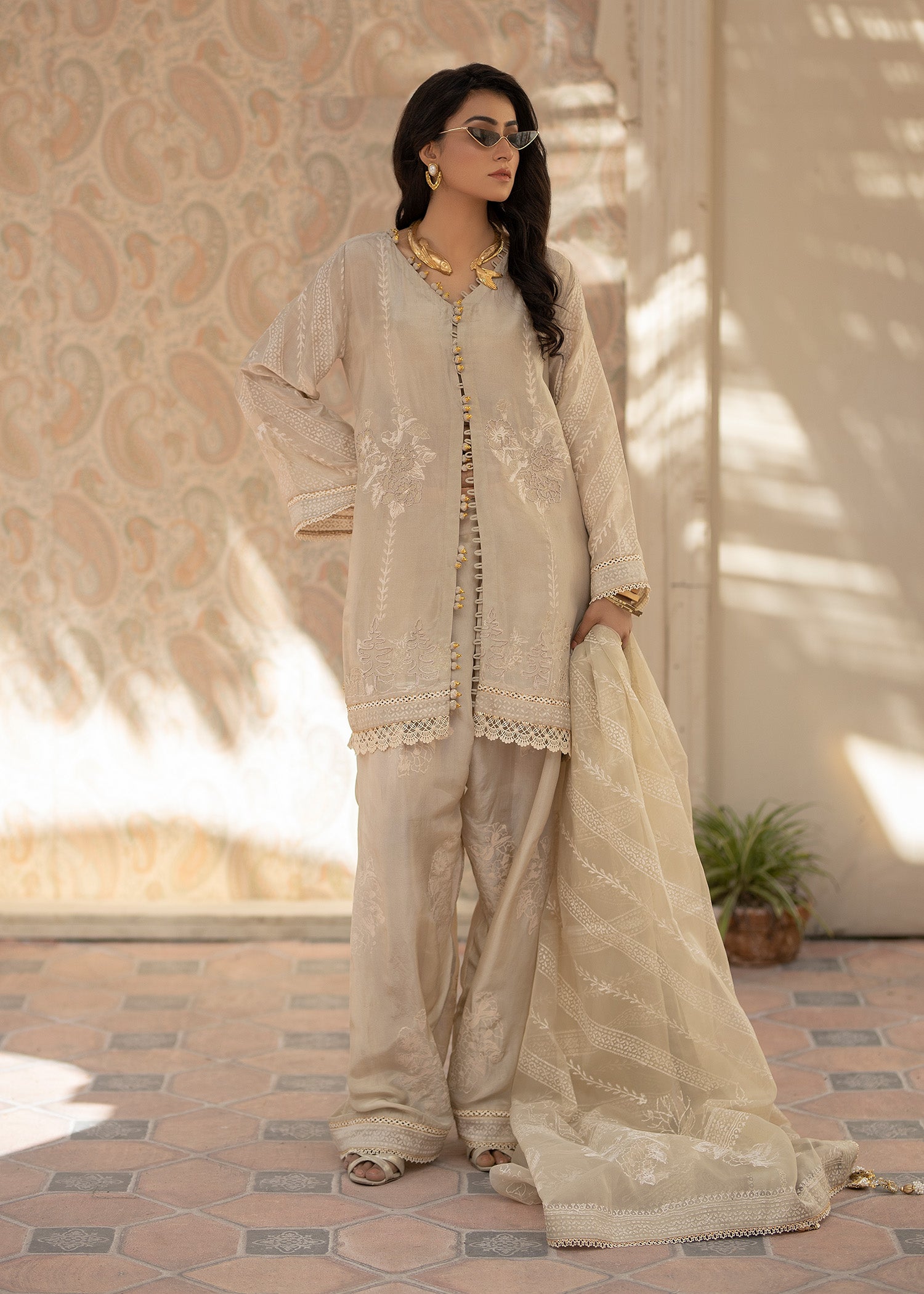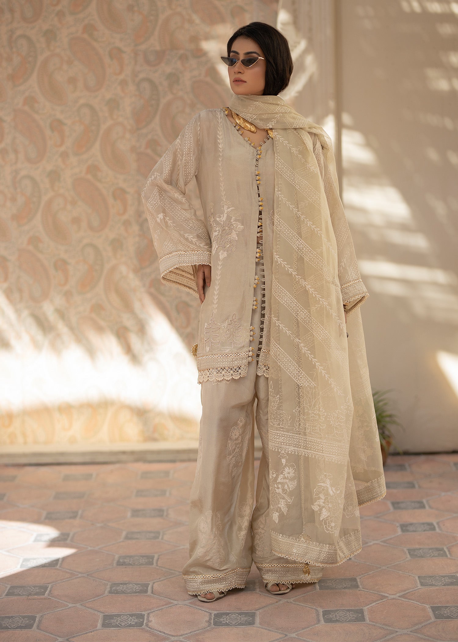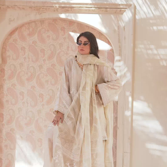 This ivory hued three-piece ensemble is a stunning blend of elegance and understated glamour.This Shirt, made from pure tusser silk , features a minimal neckline that is intricately embellished with sparkling tussels and stitching details, adding a subtle touch of luxury. The organza dupatta is dyed in the same color, creating a soft effect that flows effortlessly. It is secured in place with a gorgeous block print, finished wuth four side borders and details on both paloo , adding a unique and refined detail to the overall look. The outfit is completed with a farshi pure tusser silk shalwar, offering both comfort and sophistication. This ensemble combines contemporary elegance with classic charm, making it an ideal choice for any special occasion.