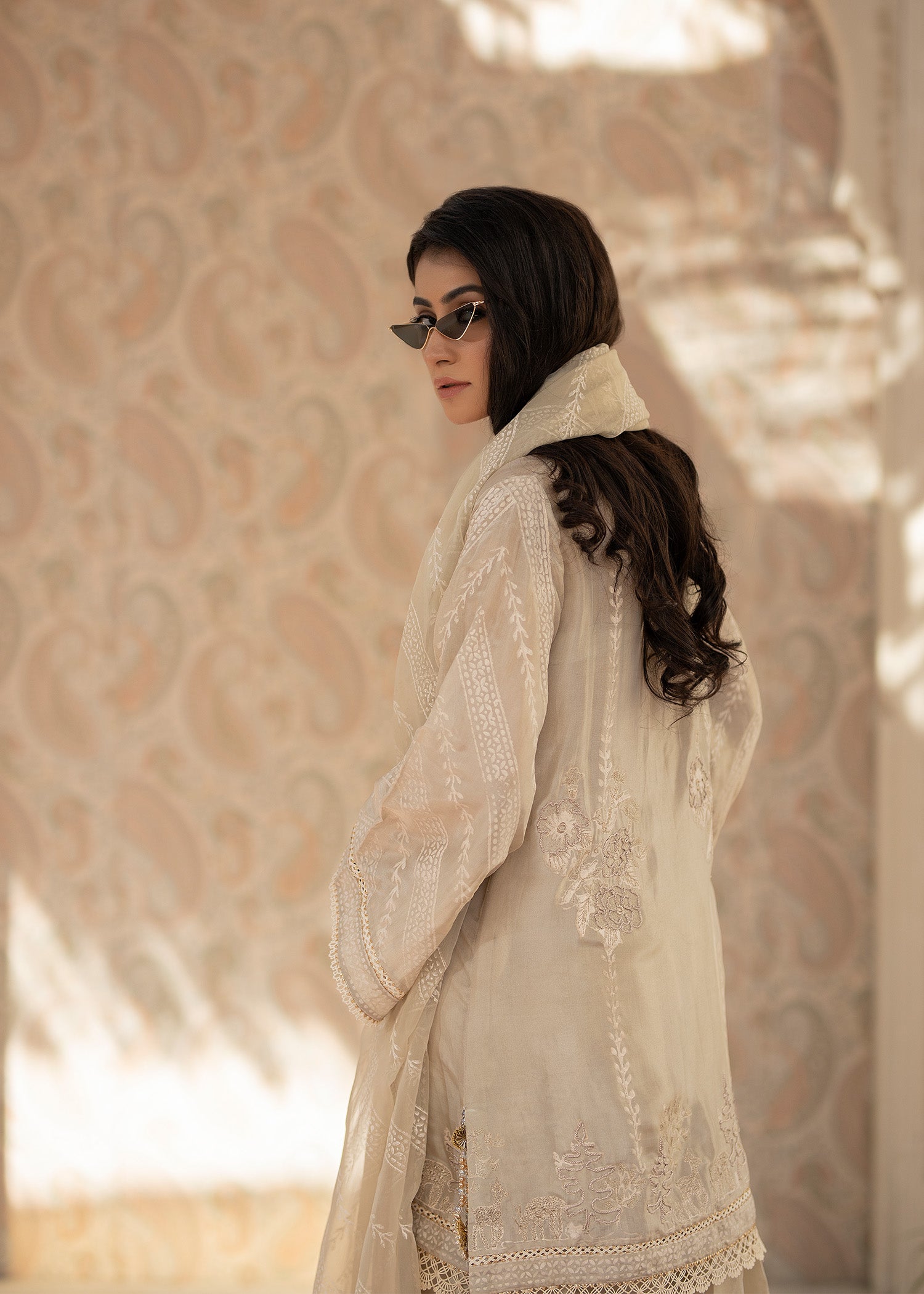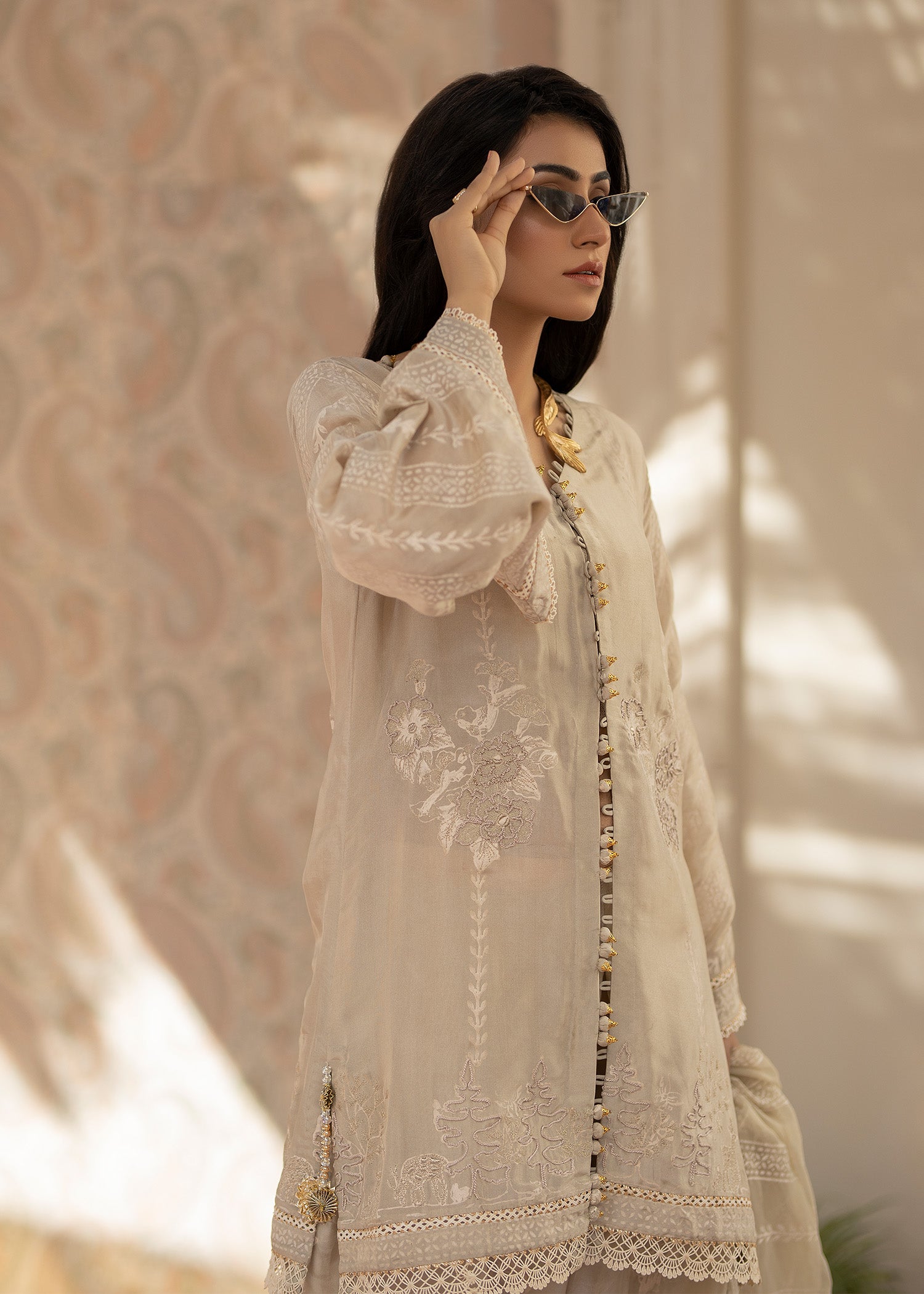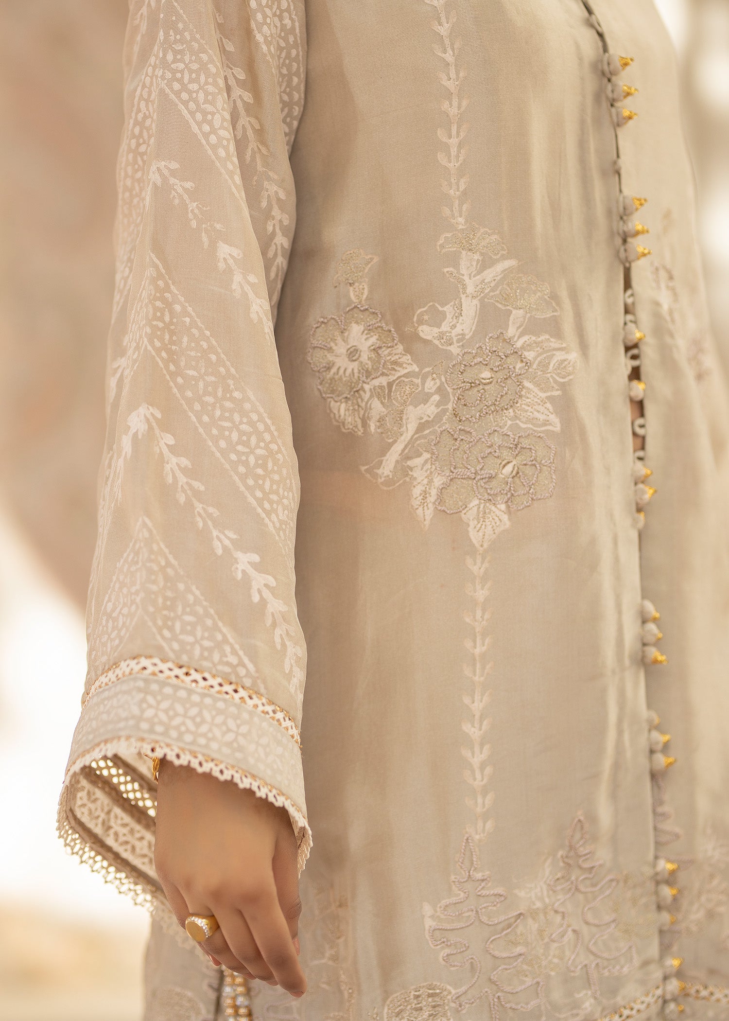 This ivory hued three-piece ensemble is a stunning blend of elegance and understated glamour.This Shirt, made from pure tusser silk , features a minimal neckline that is intricately embellished with sparkling tussels and stitching details, adding a subtle touch of luxury. The organza dupatta is dyed in the same color, creating a soft effect that flows effortlessly. It is secured in place with a gorgeous block print, finished wuth four side borders and details on both paloo , adding a unique and refined detail to the overall look. The outfit is completed with a farshi pure tusser silk shalwar, offering both comfort and sophistication. This ensemble combines contemporary elegance with classic charm, making it an ideal choice for any special occasion.