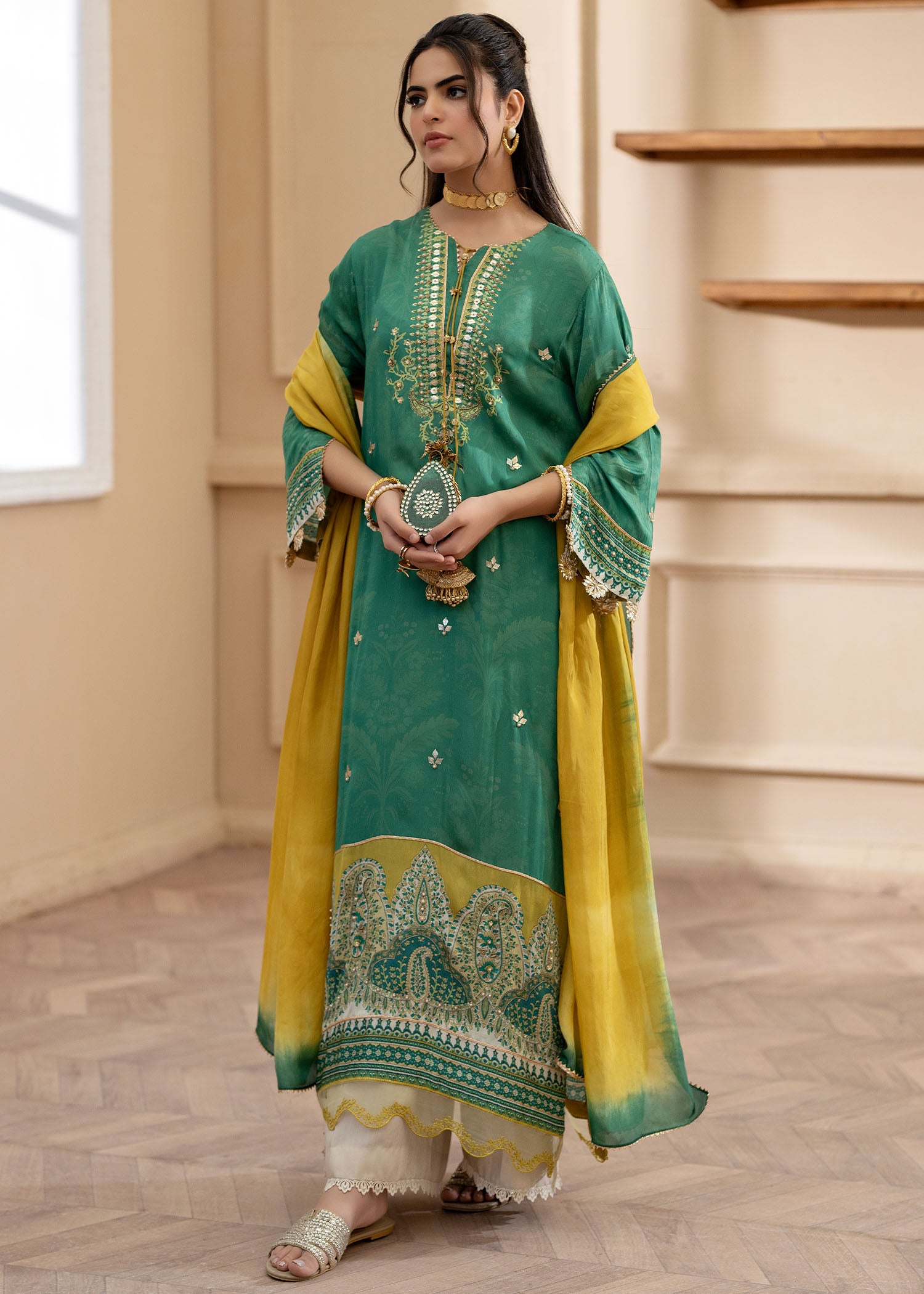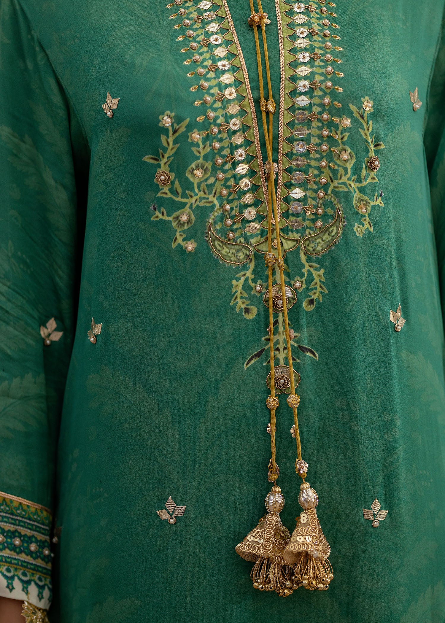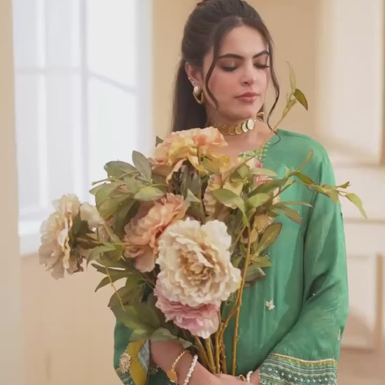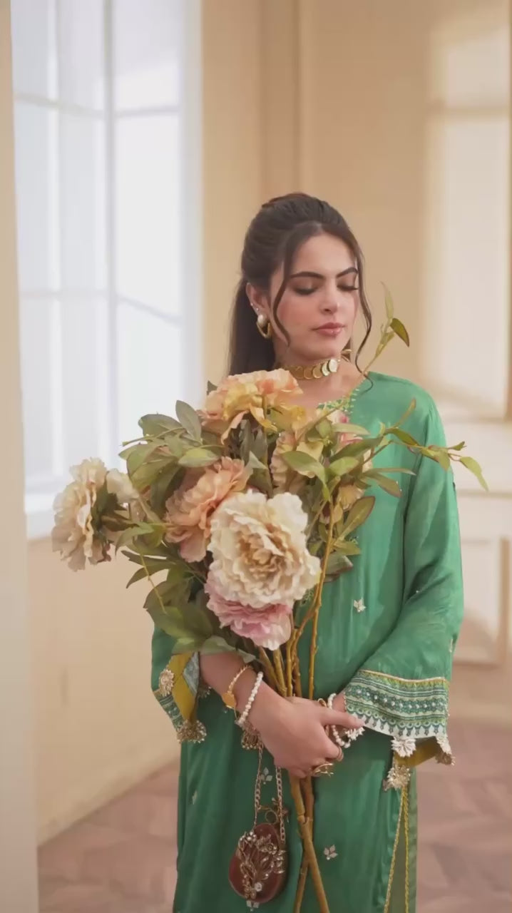 Cut from pure satin silk, this universally flattering silhouette will become your forever favourite!A deep green, with eye catching pops of lime is further enhanced with hand embellished pearls and sequins. Paired with a medium silk two tone dupatta and viscous pants adorned with cutwork on hem.