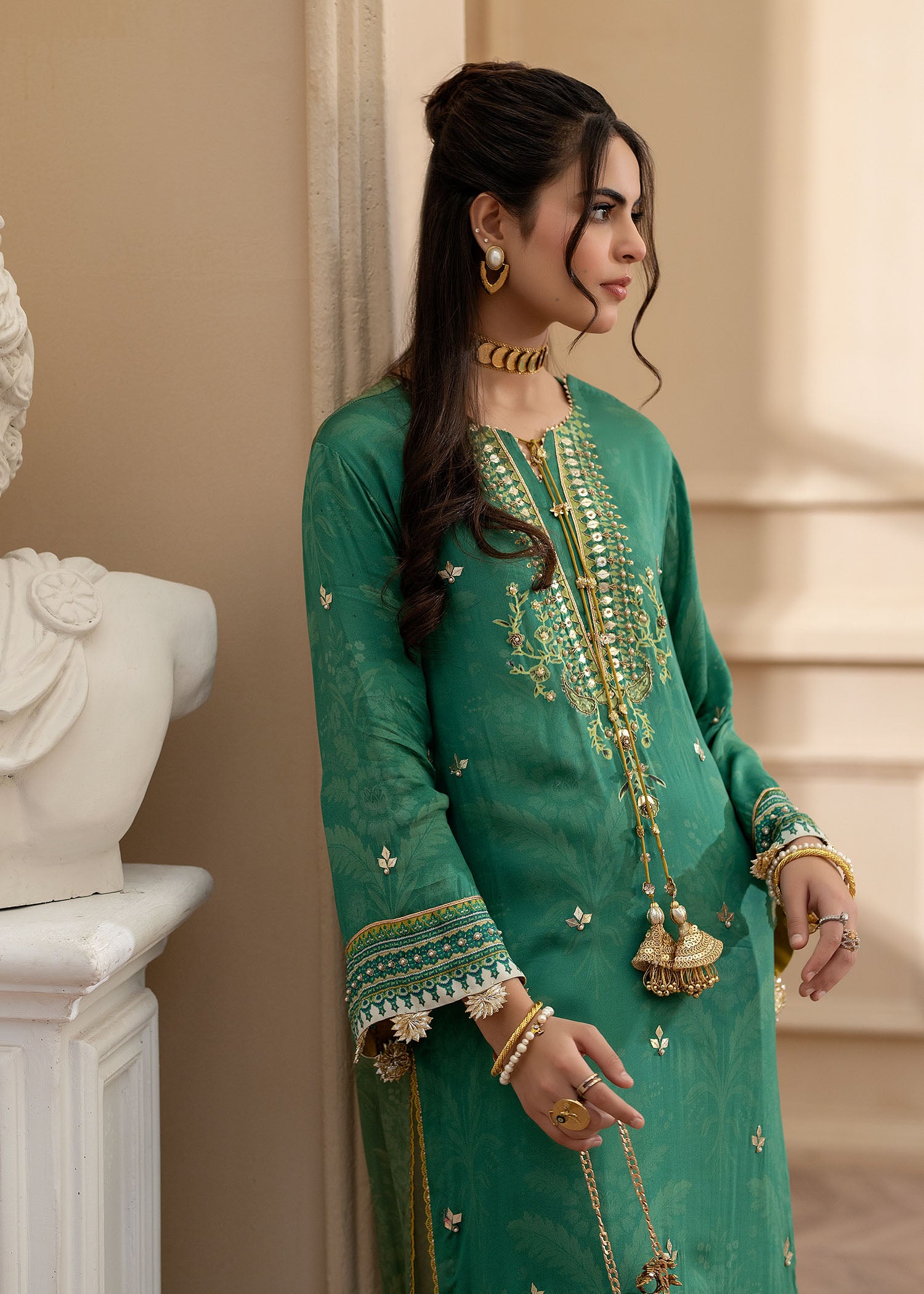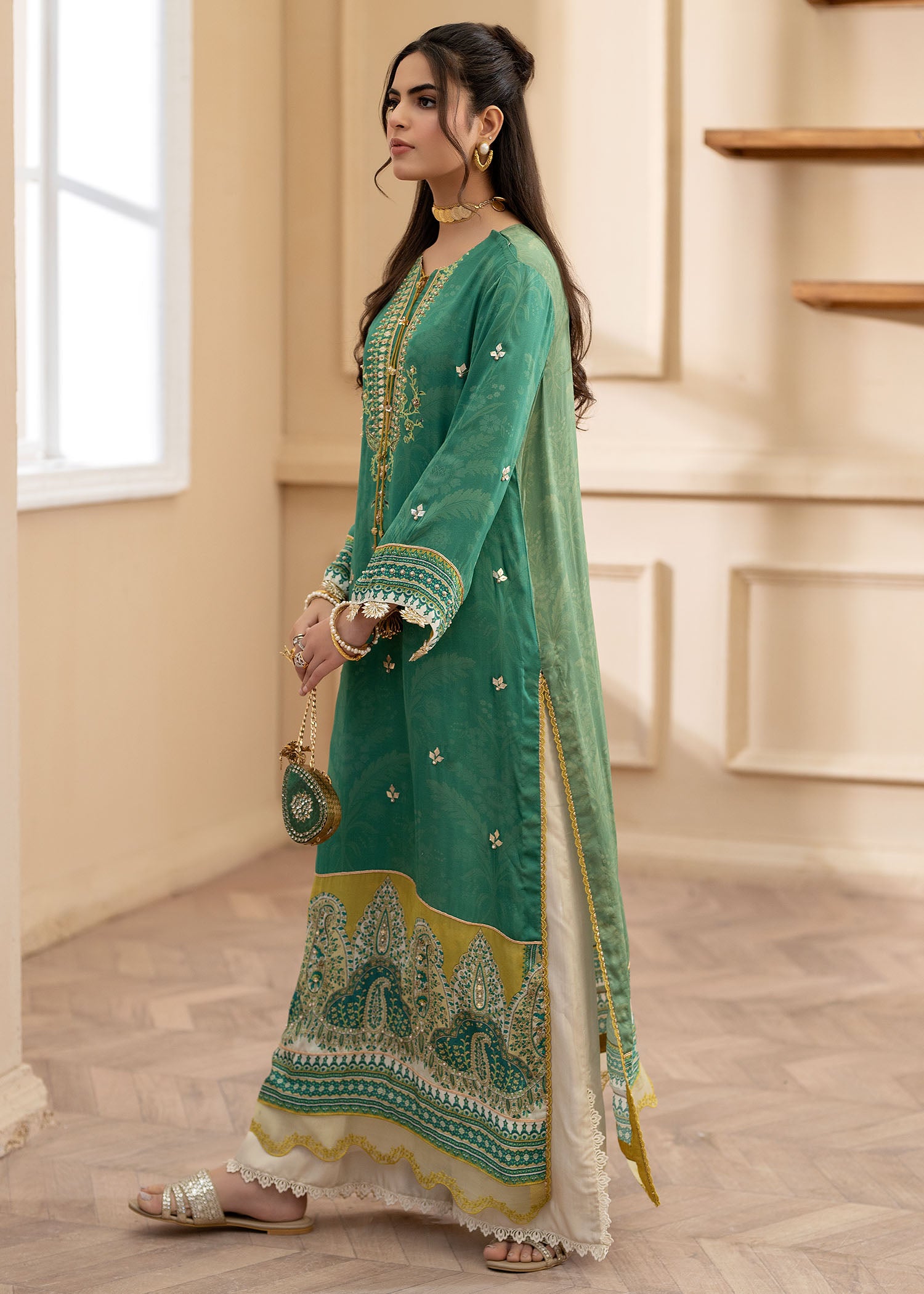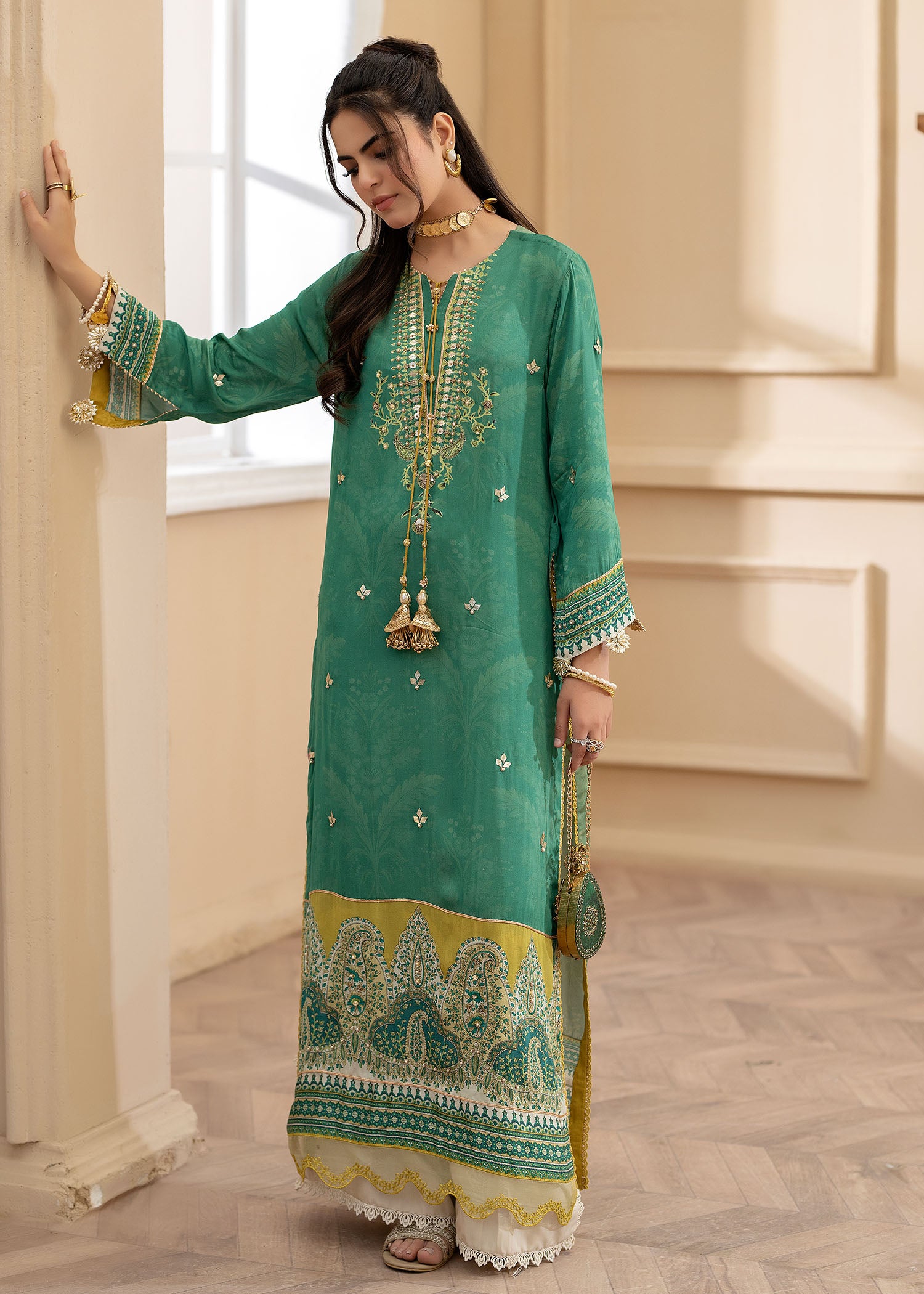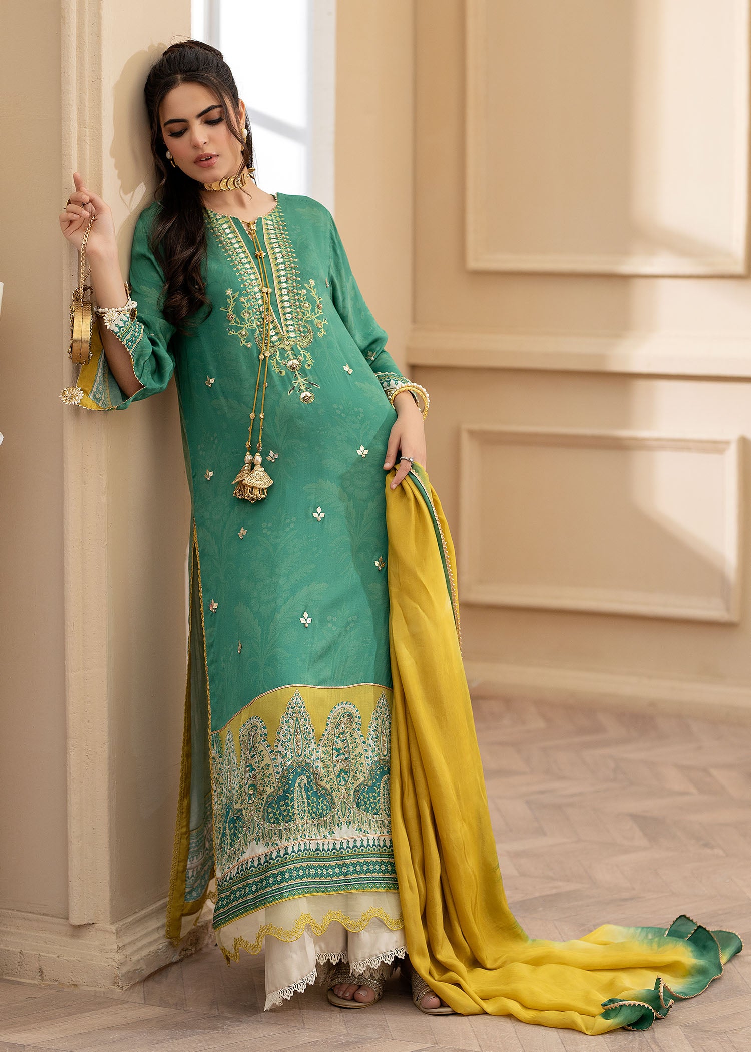 Cut from pure satin silk, this universally flattering silhouette will become your forever favourite!A deep green, with eye catching pops of lime is further enhanced with hand embellished pearls and sequins. Paired with a medium silk two tone dupatta and viscous pants adorned with cutwork on hem.