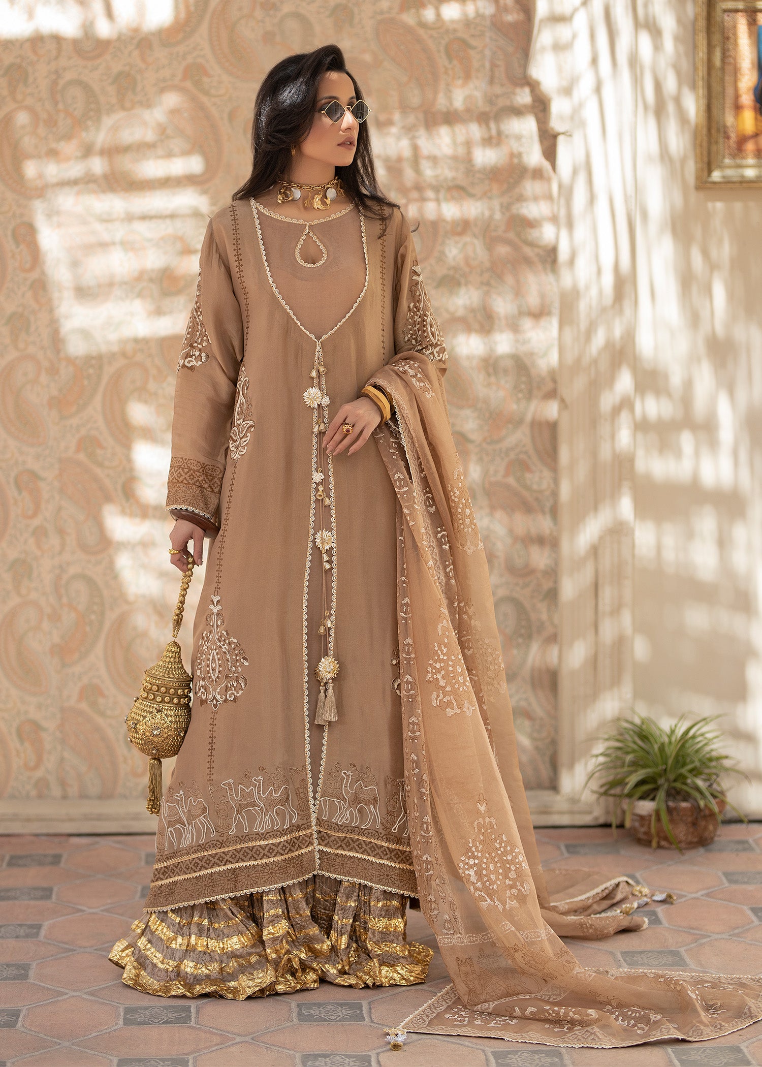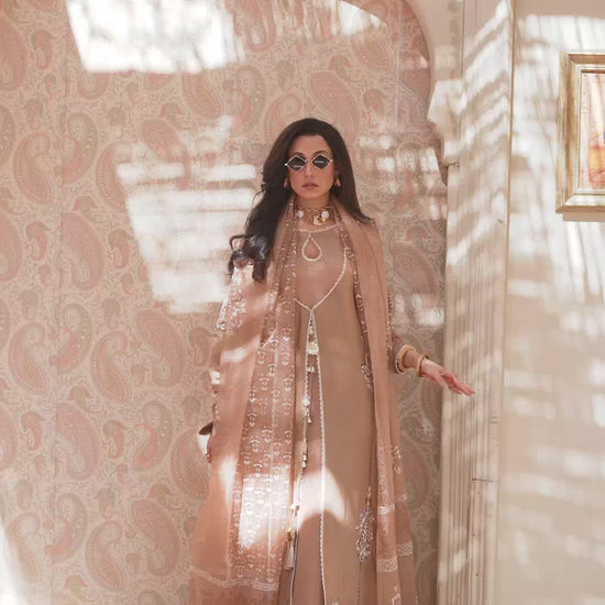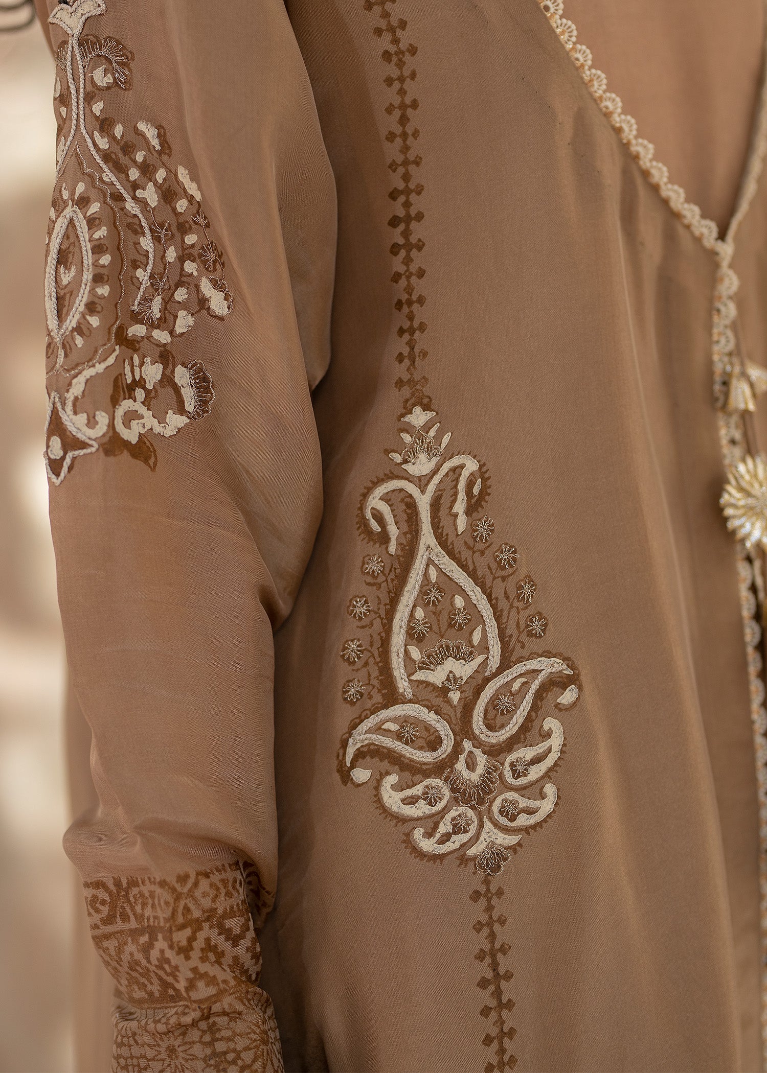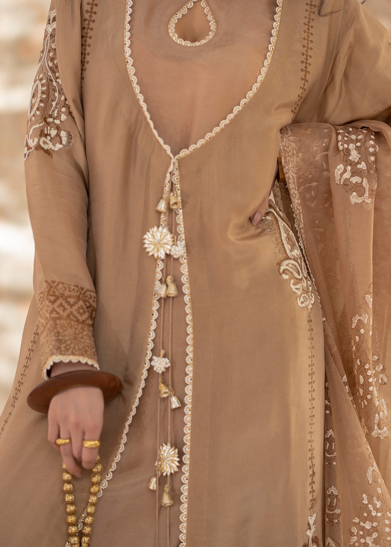 The coffee brown jacket is a striking choice, with its rich, luxurious fabric that exudes elegance and sophistication. tusser silk has a unique texture, giving the garment a refined yet understated appeal. The intricate doriwork on the hem adds an artisanal touch, elevating the outfit with delicate, personalized detailing. This kind of craftsmanship often involves fine brown block print and ivory dori work, which can create a beautiful contrast against the brown hue of the fabric.this ensemble is paired with an organza block printed dupatta and crushed pants with golden zari bottoms .