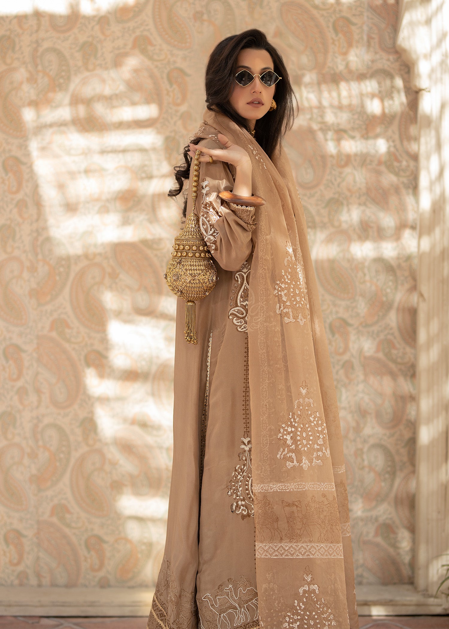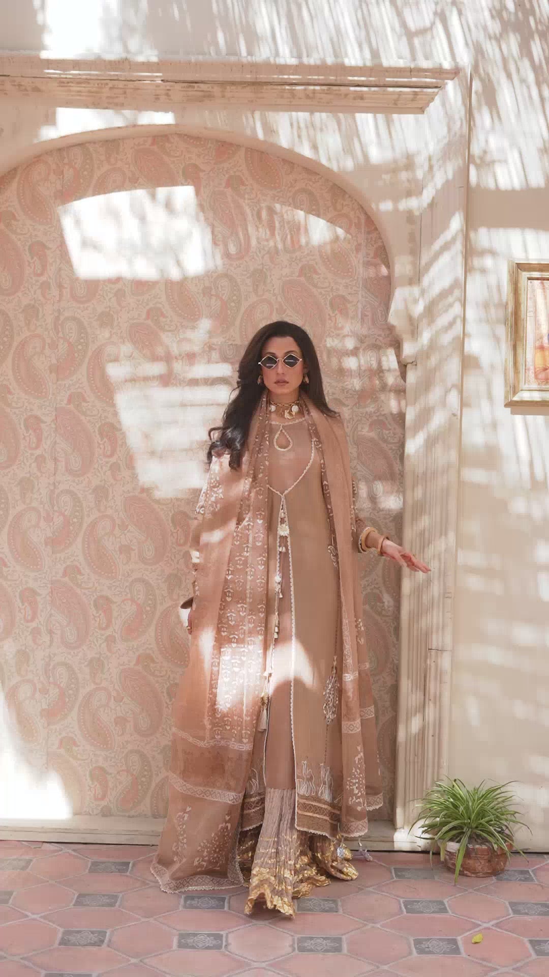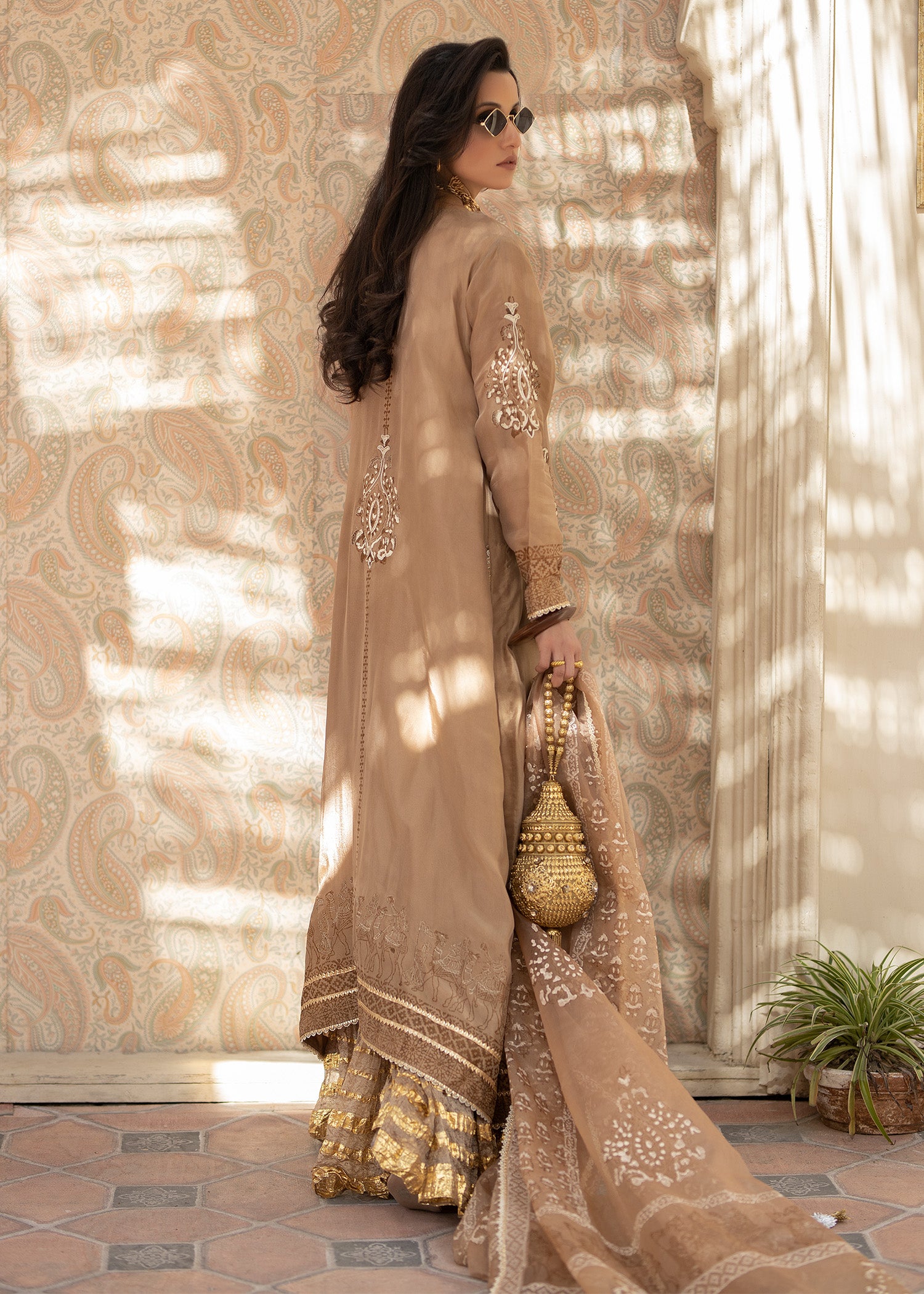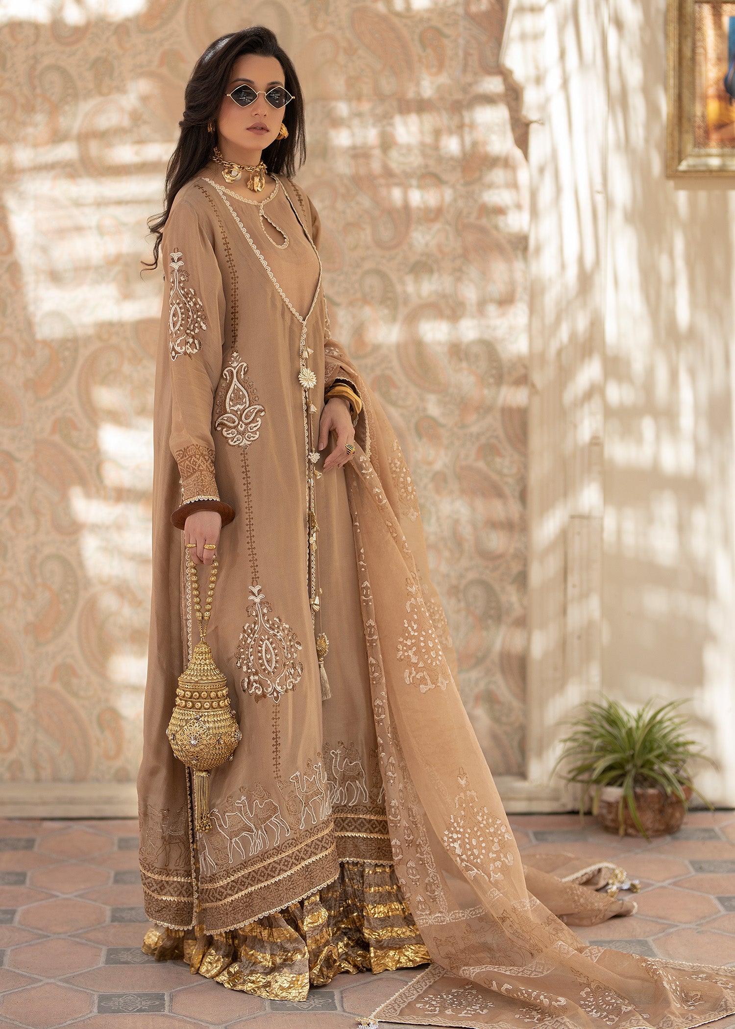 The coffee brown jacket is a striking choice, with its rich, luxurious fabric that exudes elegance and sophistication. tusser silk has a unique texture, giving the garment a refined yet understated appeal. The intricate doriwork on the hem adds an artisanal touch, elevating the outfit with delicate, personalized detailing. This kind of craftsmanship often involves fine brown block print and ivory dori work, which can create a beautiful contrast against the brown hue of the fabric.this ensemble is paired with an organza block printed dupatta and crushed pants with golden zari bottoms .