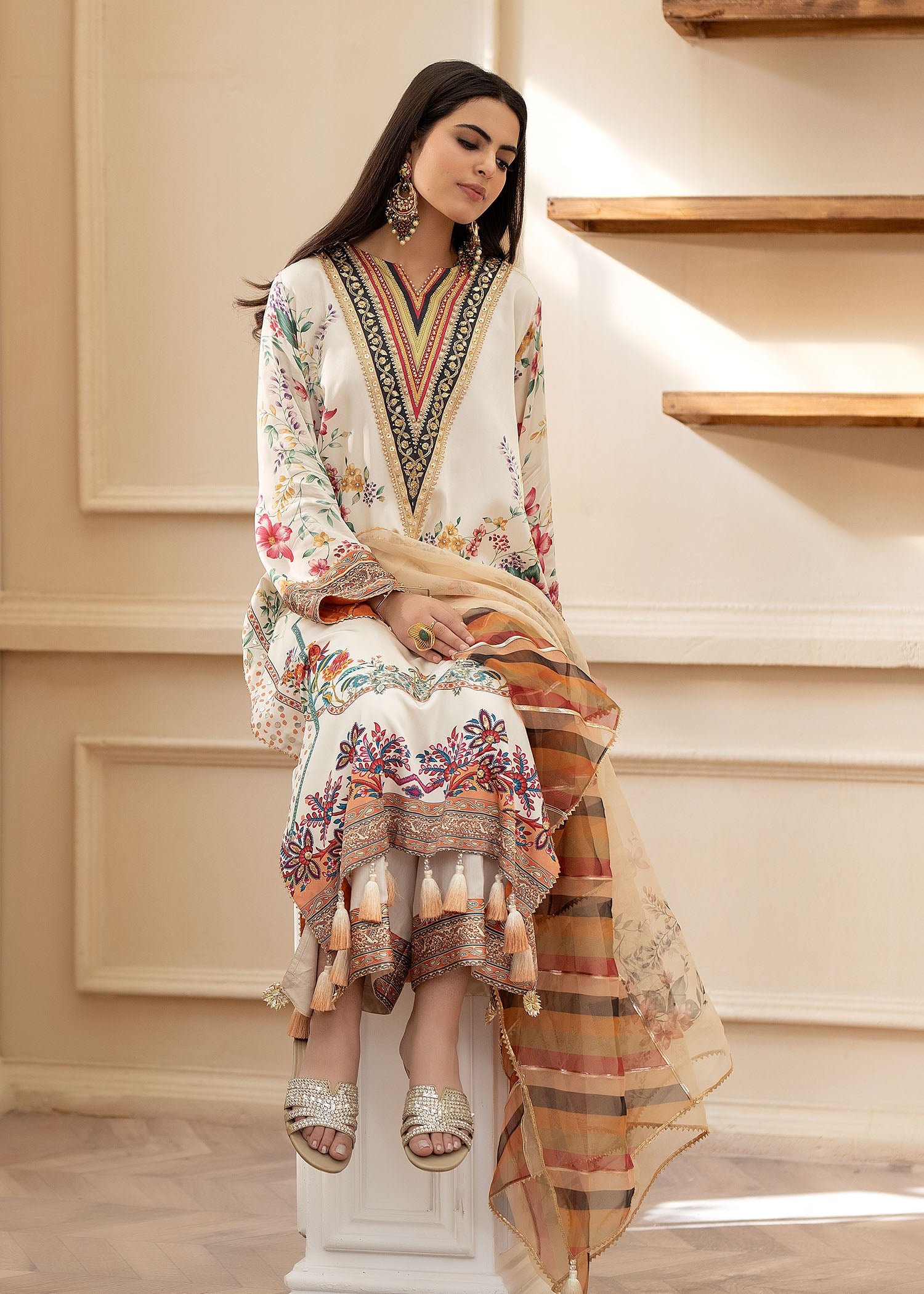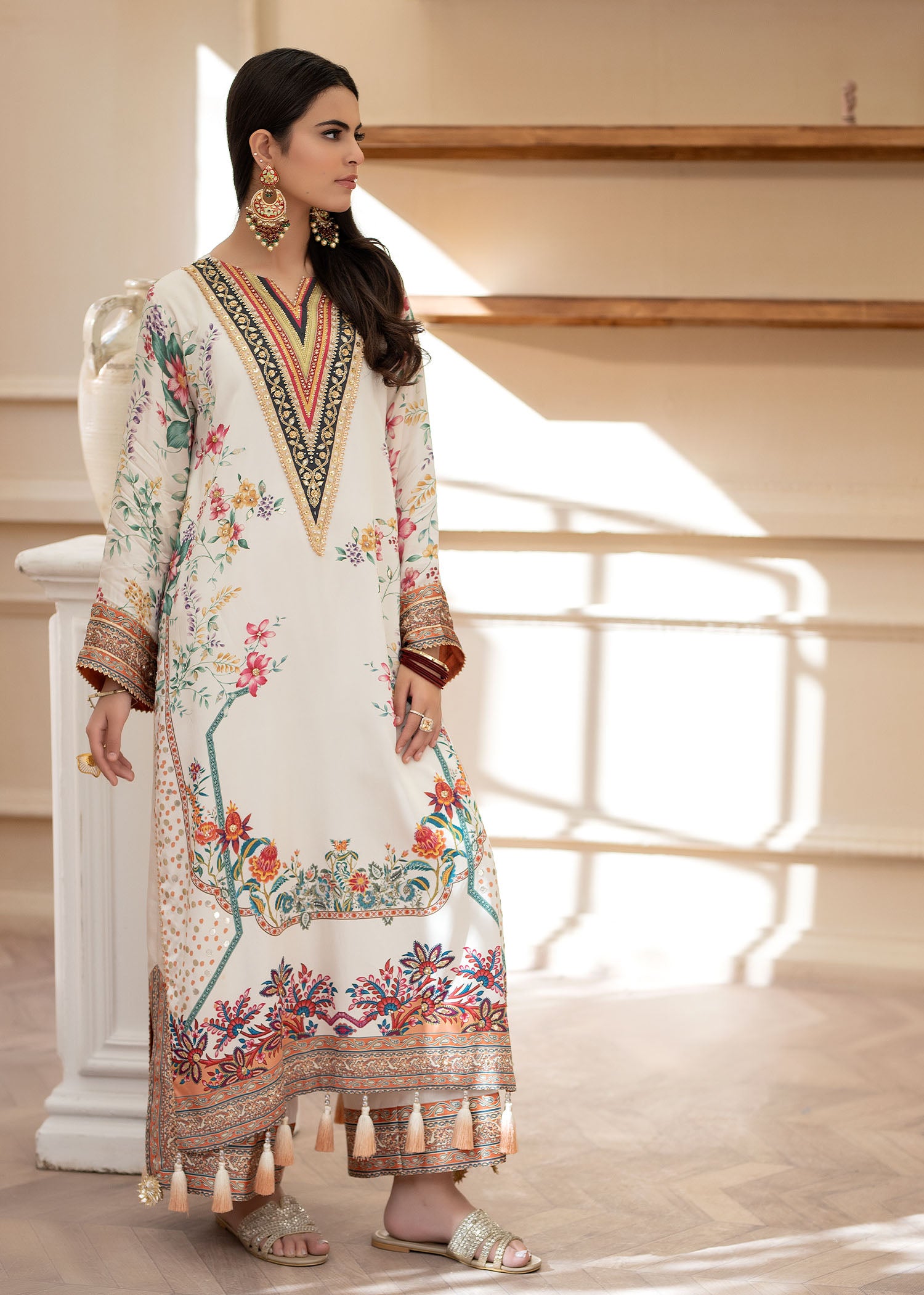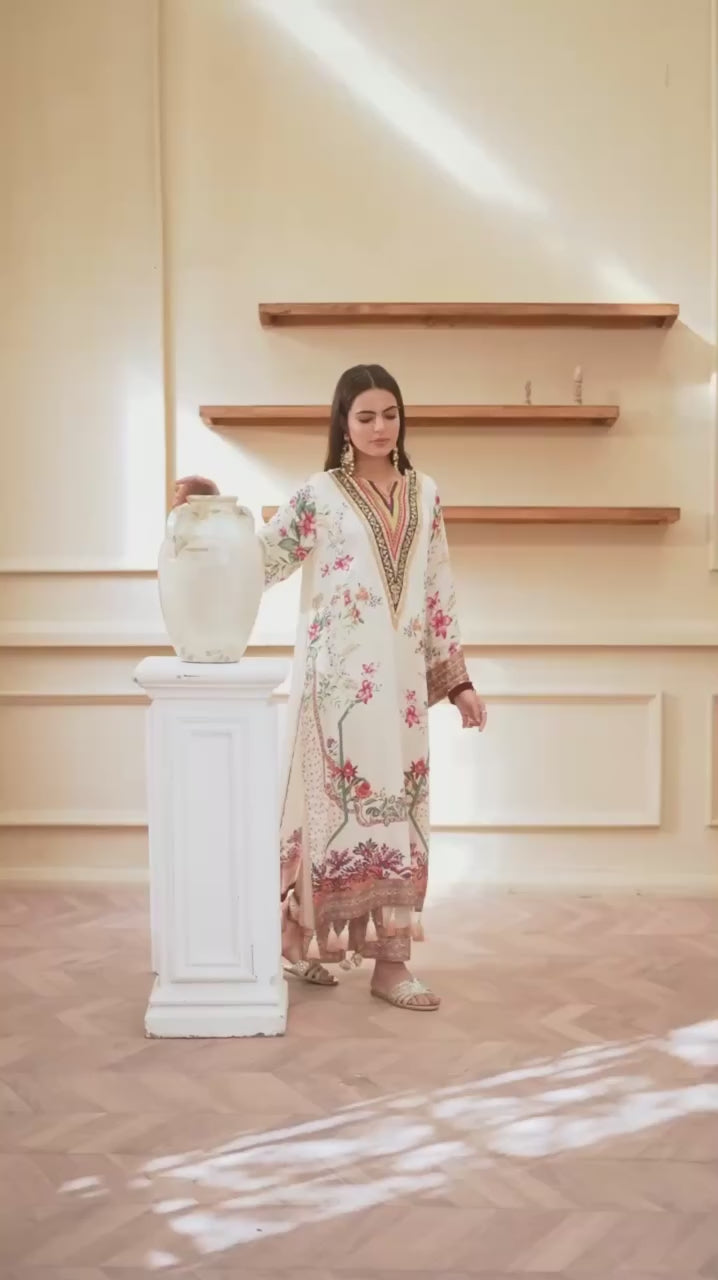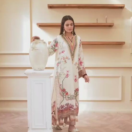 This ensemble has a canvas of ivory and pinks, artfully illustrated with a myriad of hues and pristine details. Adorned with delicate embellishments on the neckline, sleeves and daaman .tussles are attached on hem to add more details , paired with a coordinated viscose pants .