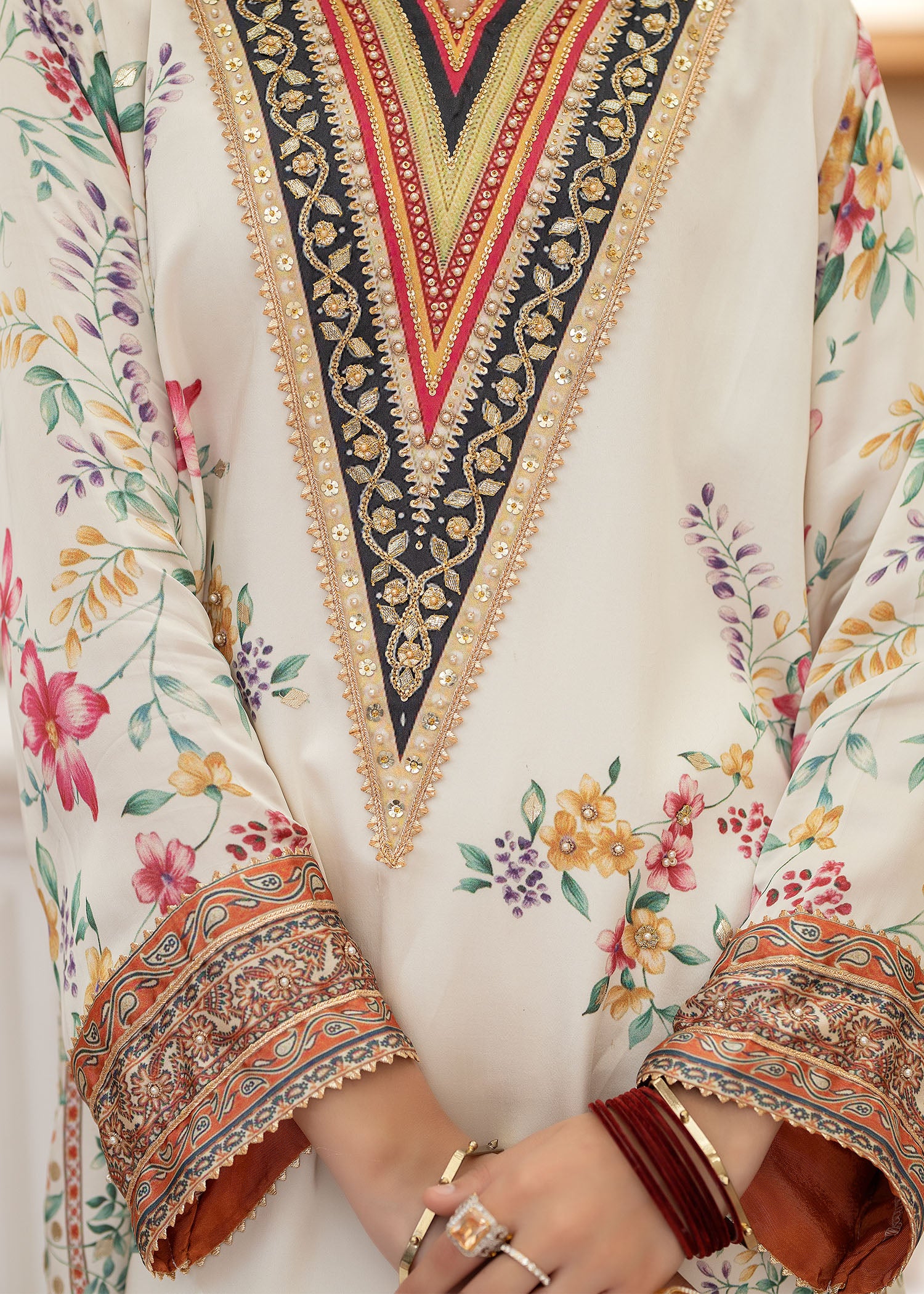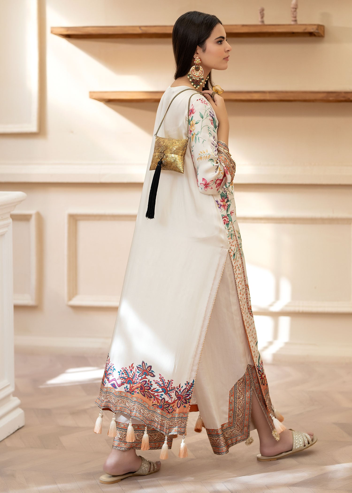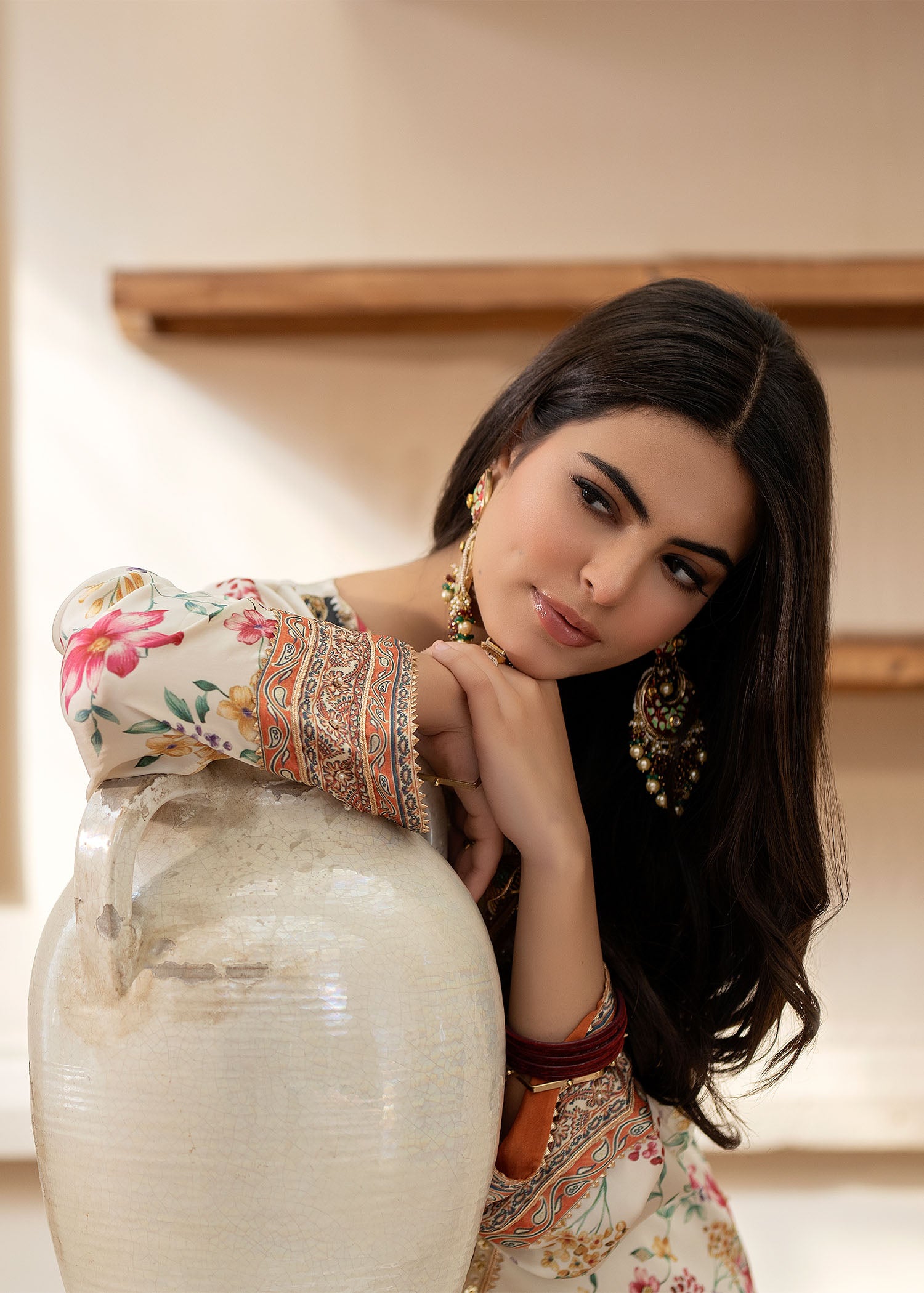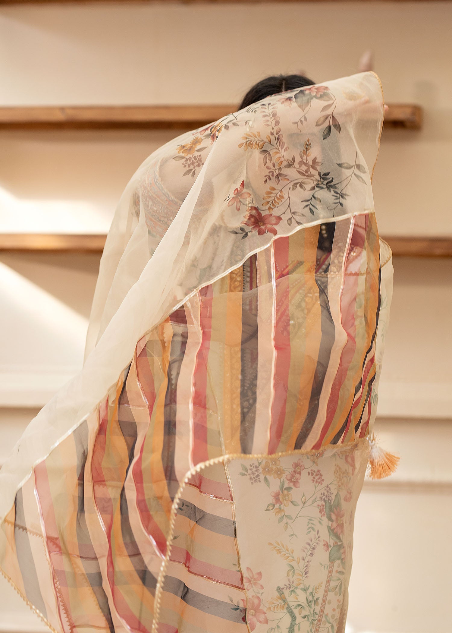 This ensemble has a canvas of ivory and pinks, artfully illustrated with a myriad of hues and pristine details. Adorned with delicate embellishments on the neckline, sleeves and daaman .tussles are attached on hem to add more details , paired with a coordinated viscose pants .